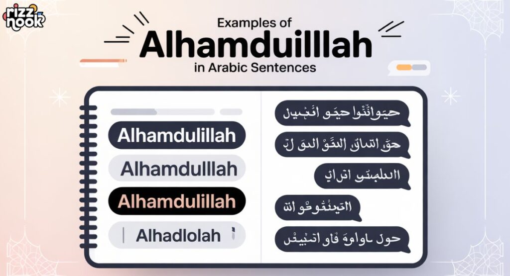 These examples show how Alhamdulillah in daily life can be used in prayers, casual conversation, or written Arabic. Practicing these sentences helps reinforce both spiritual and linguistic understanding.